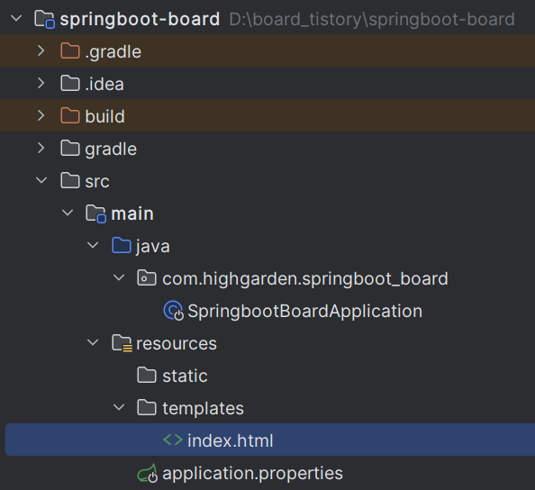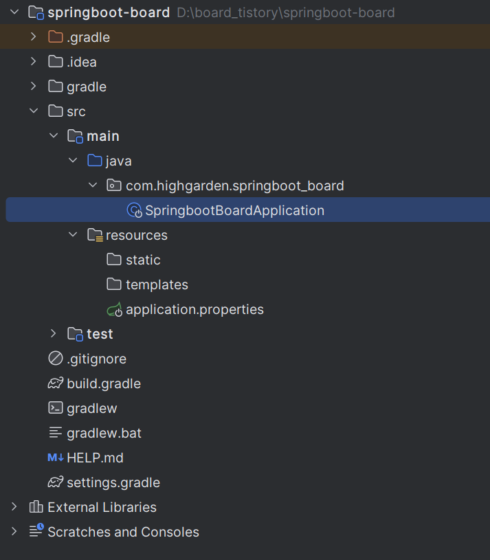 D드라이브에 board_tistory라는 폴더를 하나 만들고 그 안에 프로젝트폴더 압축을 풀어준다. IDE를 사용해 프로젝트를 실행하면 다음과 같은 프로젝트 경로를 확인할 수 있다. 나는 InteliJ ultimate버전을 사용했다.