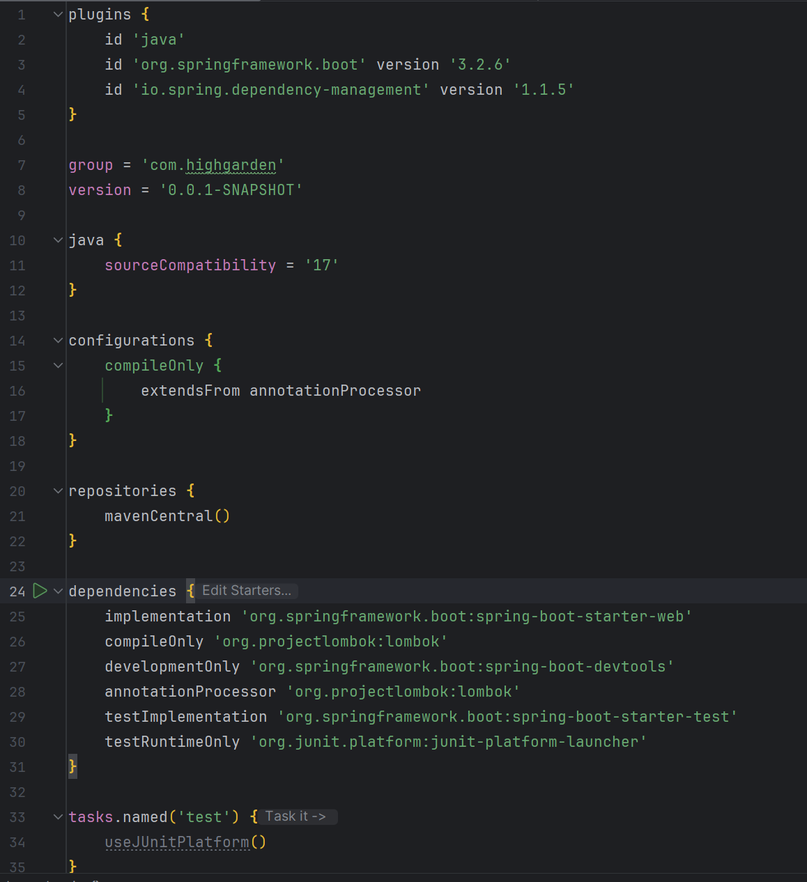 build.gradle파일을 눌러서 확인해보면 의존성을 확인할 수 있다. 프로젝트를 생성할 때 넣어준 의존성 목록들이 잘 있는지 확인해 보자. spring boot web과 devtools, lombok이 잘 들어와 있다.