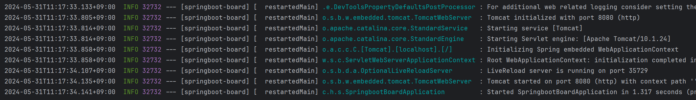 로그를 확인해 보니 서버가 잘 작동한다. spring boot는 기본적으로 tomcat이 내장되어 있어 따로 tomcat을 다운로드하고 버전을 맞추는 등의 복잡한 작업을 할 필요가 없다. 로그를 확인해 보면 tomcat이 시작되었고 8080 포트라는 것을 알 수 있다. 기본 디폴트 포트는 8080번인데 나중에 설정을 통해 변경 가능하다.