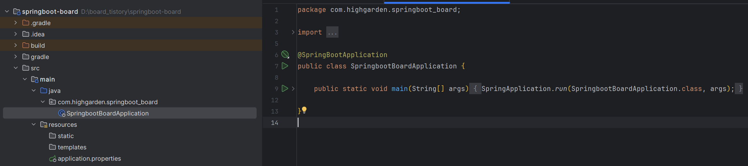 D드라이브에 board_tistory라는 폴더를 하나 만들고 그 안에 프로젝트폴더 압축을 풀어준다. IDE를 사용해 프로젝트를 실행하면 다음과 같은 프로젝트 경로를 확인할 수 있다. 나는 InteliJ ultimate버전을 사용했다.