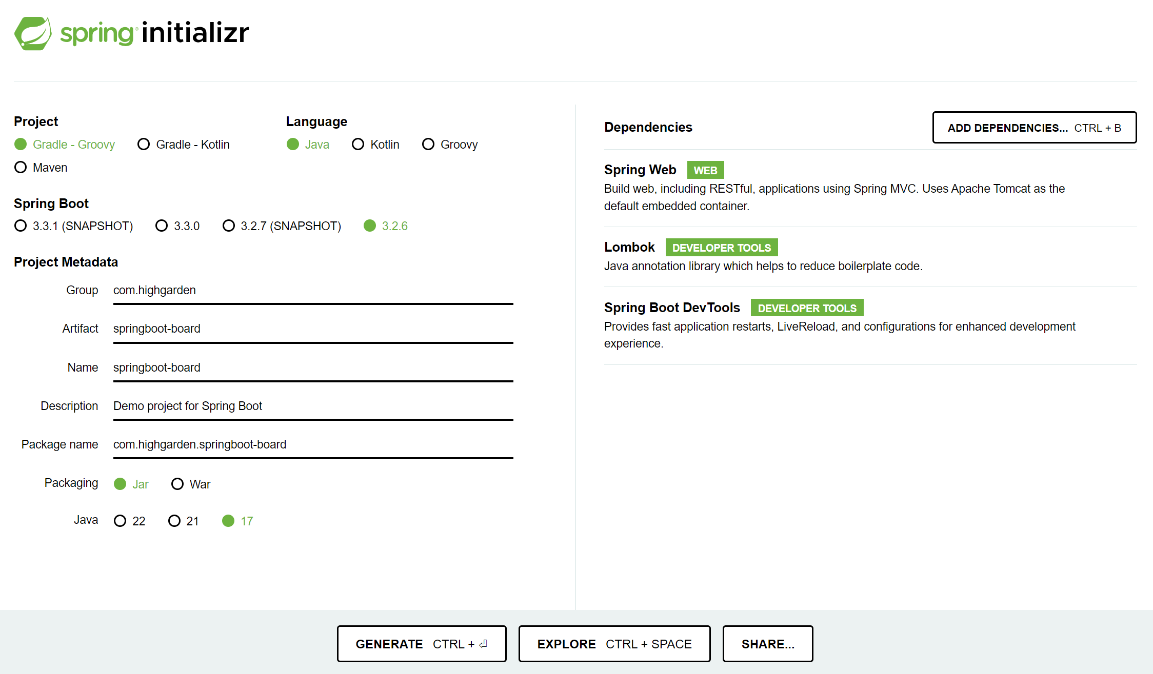 -의존성: Spring Web, Lombok, Spring Boot DevTools