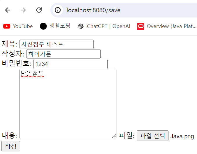 글을 작성하는 화면에 파일선택 태그가 생성되었고 파일선택도 작 되는 것을 확인할 수 있다. 작성버튼을 누르면 submit되면서 서버로 form데이터가 전송된다.