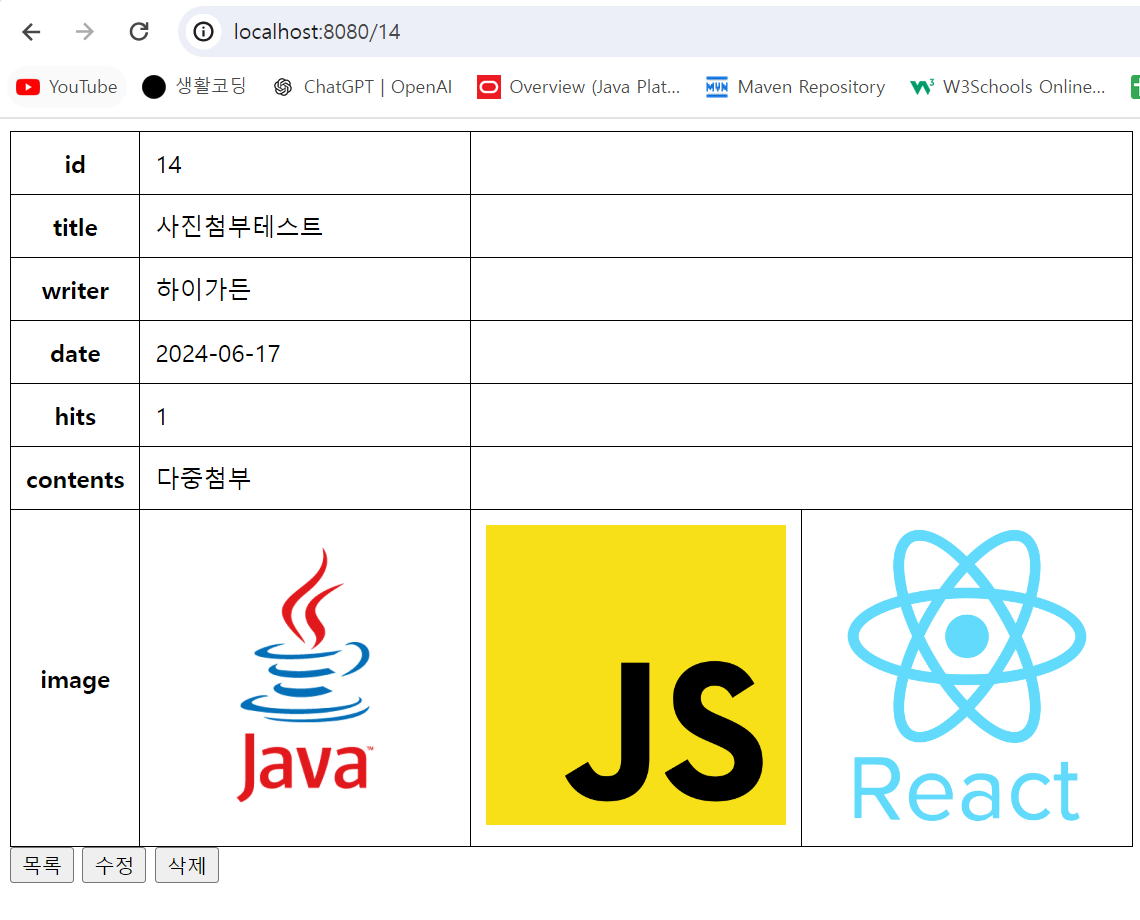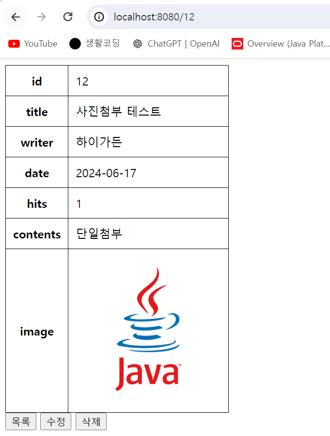 다시 상세조회를 했을 때 글내용과 사진파일이 화면에 잘 출력된다.