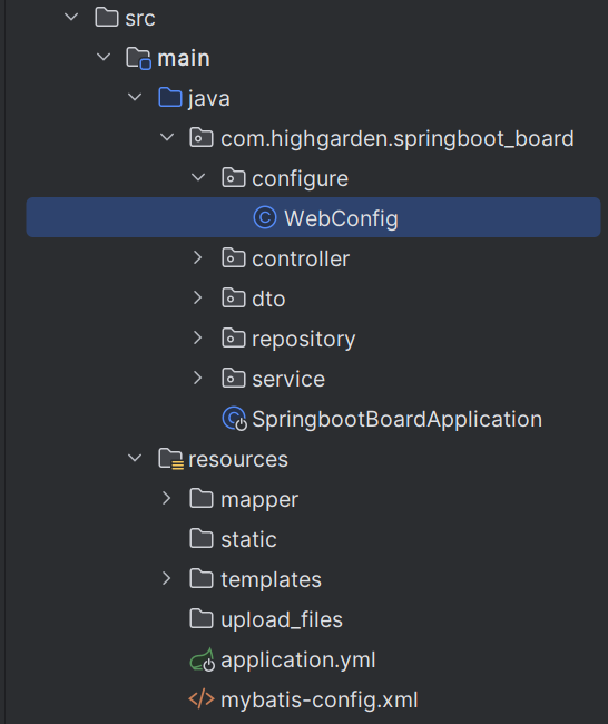 프로젝트 경로에 configure라는 디렉토리를 추가하고 Webconfig라는 클래스를 생성해 WebMvcConfigurer인터페이스를 구현한다. controller, service, dto등의 디렉토리와 같은레벨에 생성하면 된다.