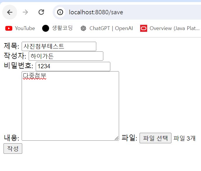 다중첨부를 고려하여 구현하였기 때문에 다중첨부도 테스트 해본다. 3개의 png 파일을 선택하고 작성버튼을 눌러본다.