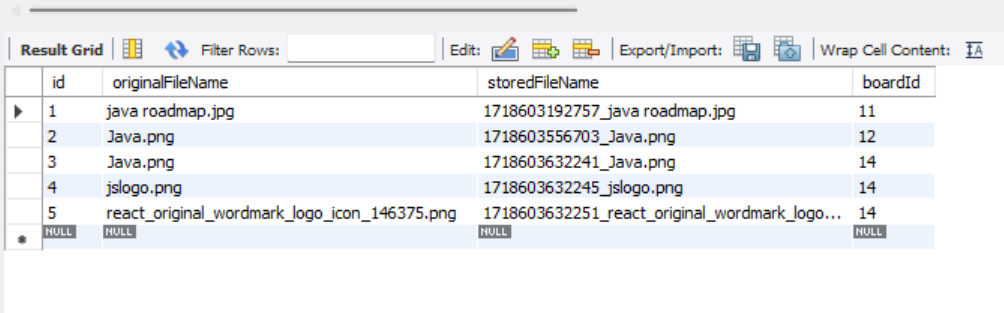 반면 board_file_table은 다중첨부의 경우 board_table 1건에 대해 3건의 row가 추가된 것을 볼 수 있다.