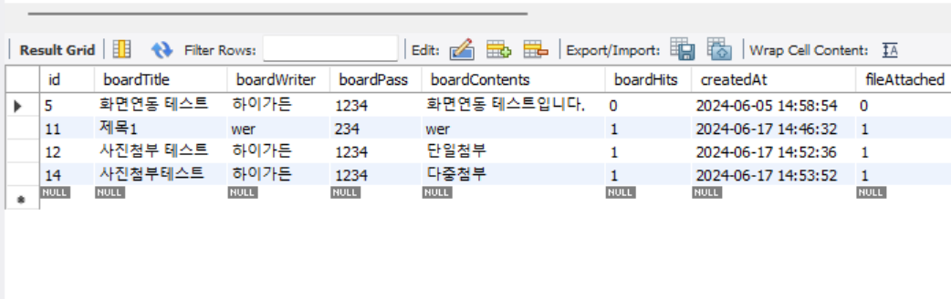 마지막으로 실제 데이터도 db에 잘 저장되었는지를 확인해보자. board_table데이터 에는 단일첨부 1건과 다중첨1부 1건이새로 추가된것을 알 수 있다.
