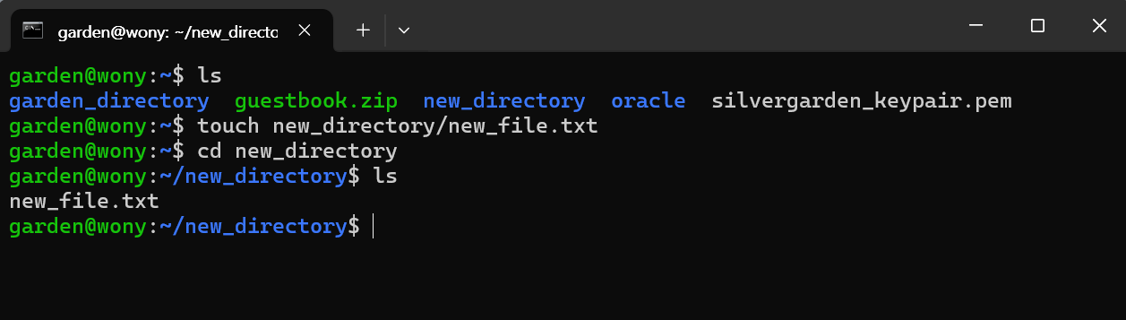 touch로 작업할 디렉토리를 지정해주고 파일을 생성한다. 현재 디렉토리에있는 `new_directory` 안에 `new_file.txt`라는 텍스트 파일을 생성한다는 의미가 된다. 해당경로에 파일이 잘 생성된 것을 확인할 수 있다.