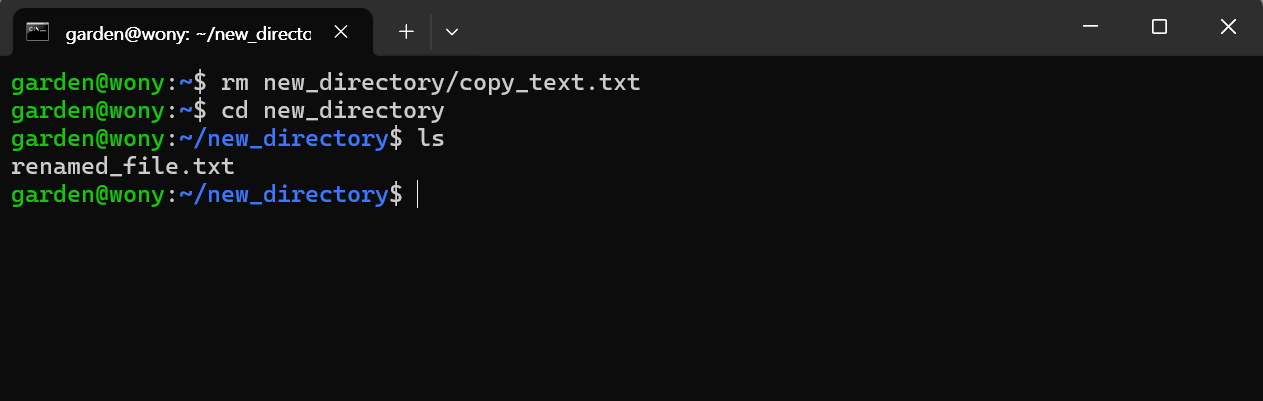 위에서 생성한 `copy_text.txt`는 삭제되고 `renamed_file.txt`파일만 남은 것을 확인할 수 있다.