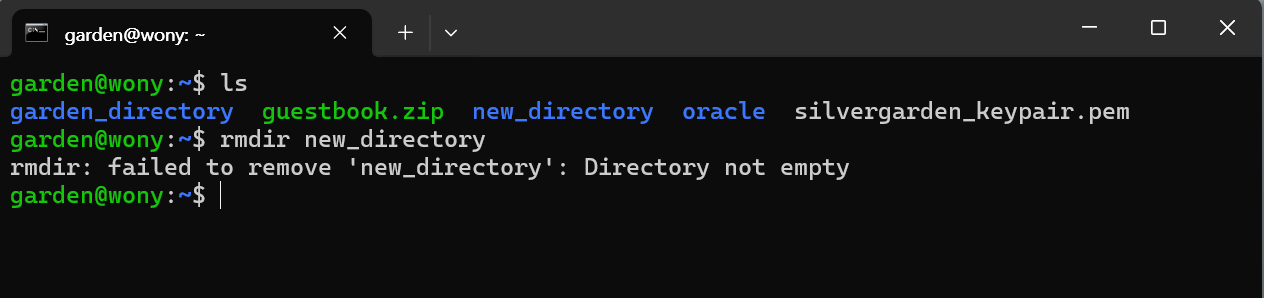 디렉토리를 삭제하려고 하니 이런 오류메시지가 출력된다. 현재 `new_directory`안에는 파일이 들어있다. 때문에 `rmdir` 명령어로는 디렉토리를 삭제할 수 없다. 빈 디렉토리라면 위 명령어로 잘 작동하지만 안에 파일이 존재하는 경우는 다른 방식을 사용해야 한다.