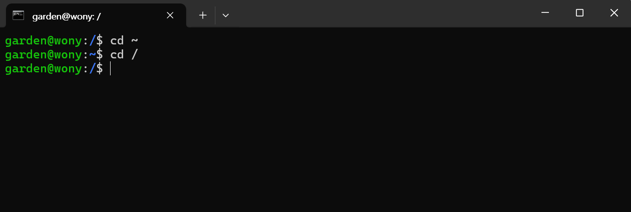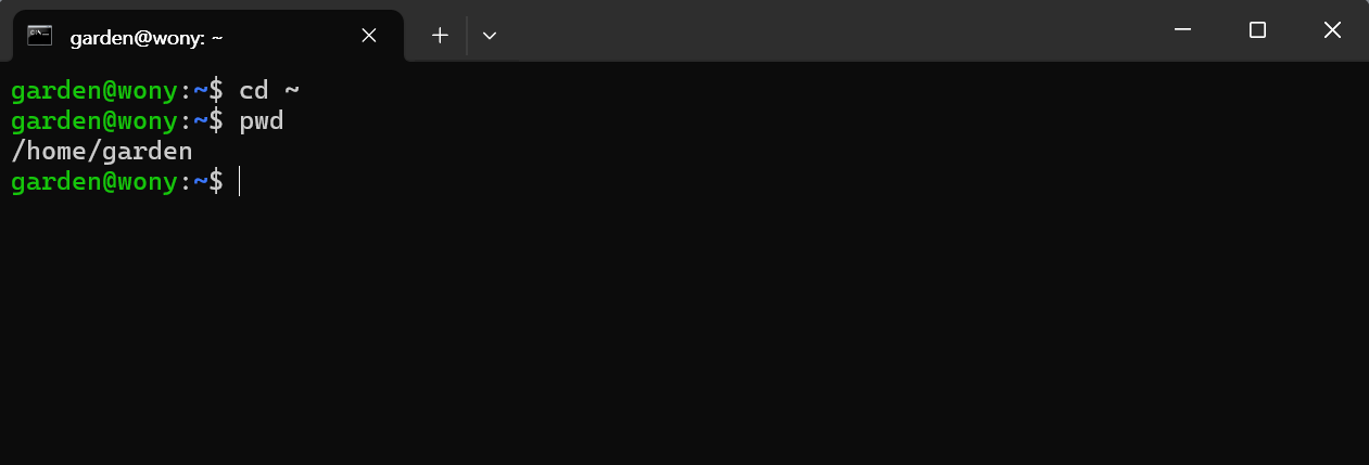 `cd ~` 는 홈디렉토리로 이동한다. 리눅스에서 home경로는 /home/user를 말한다. 현재 나의 경우 garden이라는 user명으로 linux를 사용중이기 때문에 /home/garden경로가 나의 home디렉토리가 된다.