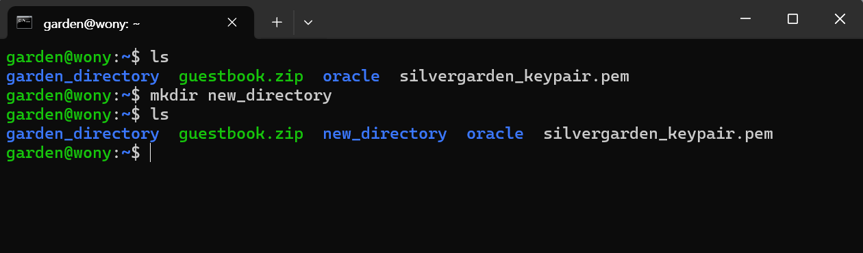 home경로에서 `mkdir`로 새로운 디렉토리를 생성한다. mkdir는 "make directory" 의 줄임말로 생각된다. mkdir뒤에는 생성할 디렉토리명을 기입한다. 위 예제에서는 `new_directory`라고 하였다. ls커맨드로 생성여부를 확인할 수 있다.