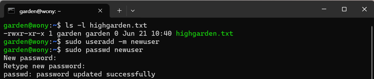 기존 `highgarden.txt`의 소유주는 `garden`이고 그룹도 `garden`으로 되어있는 것을 확인할 수 있다. 새로운 계정으로 소유권을 넘기기 위해서 계정을 생성해 준다.