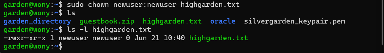 sudo chown newuser:newuser highgarden.txt위 예제에서 생성한 사용자를 삭제했으니 다시 사용자를 생성해 주도록 한다. 예제에서는 `newuser`라는 이름으로 생성하였다.