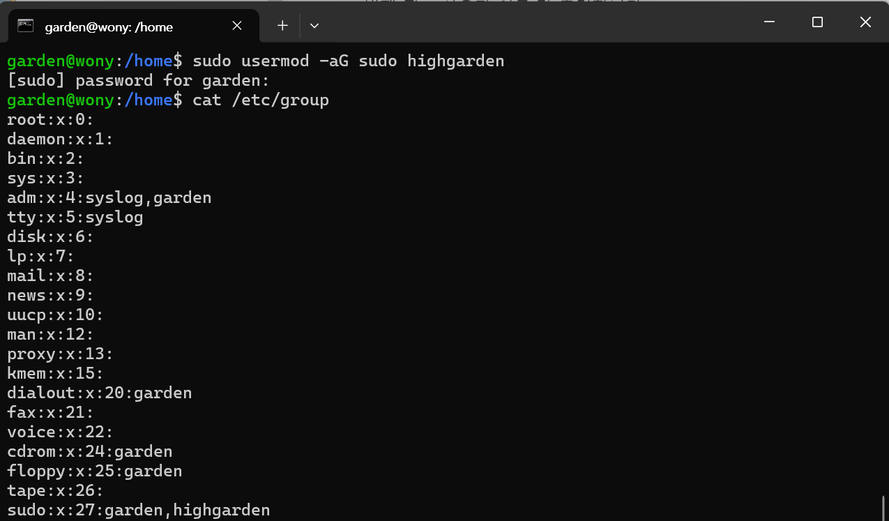 sudo usermod -aG sudo highgarden*-a: `-G`옵션과 함께 사용되며 지정하는 그룹에 계정이 추가된다. 만약 `-a` 없이 `-G`만 사용된다면 지정된 그룹 외 다른 그룹에서는 계정이 모두 삭제된다. append의 a를 의미한다.