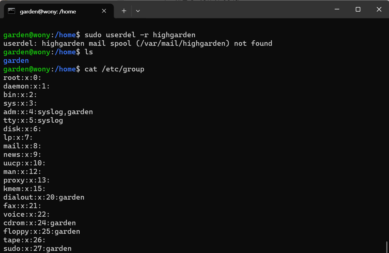 사용자계정을 삭제하니 디렉토리도 삭제되었고 group에서도 삭제된 것을 확인할 수 있다.