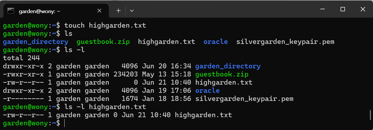 ls -l highgarden.txt일단 위에서 학습한 `touch`명령어로 txt파일을 하나 생성해 준다. 그다음 해당 파일을 `ls -l`로 조회해 보면 권한에 대한 내용이 출력되는 것을 볼 수 있다.
