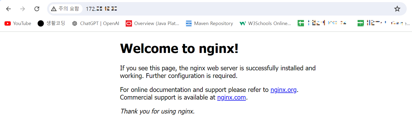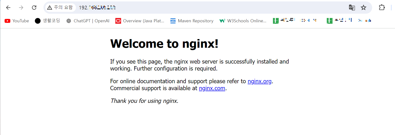 192.xxx로 시작하는 현재 pc의 ip로 브라우저에서 접속을 시도해도 nginx서버의 index페이지가 잘 보이는 것을 확인할 수 있다. 성공적으로 포트포워딩이 되었다.