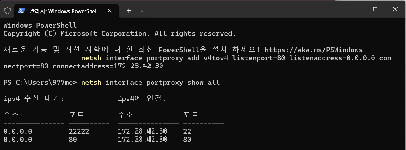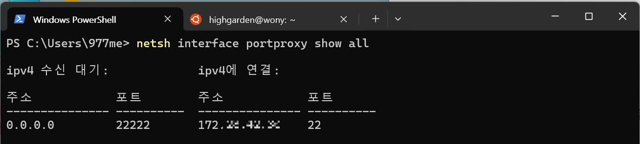 나는 기존에 ssh접속을 위해 wsl 22번 포트에 포트포워딩 규칙을 추가해 놓았기 때문에 그 내역이 존재한다. 만약 맨 처음이라면 아무것도 조회되지 않을 것이다.