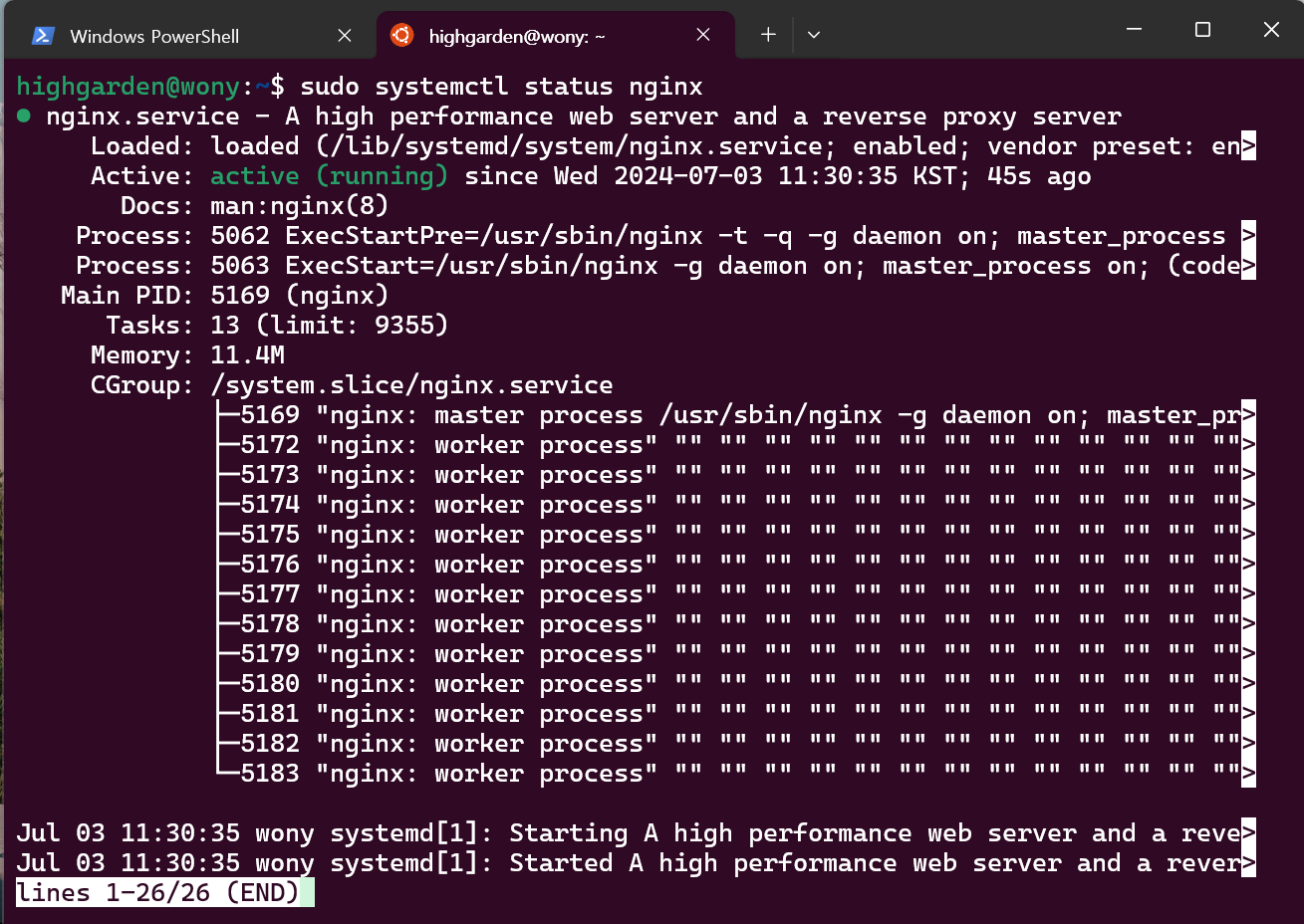 실제 서버에 접근 가능한지 테스트 해보기 위해 nginx서버를 설치하고 구동시켜 보자. wsl터미널에서 실행하도록 한다.