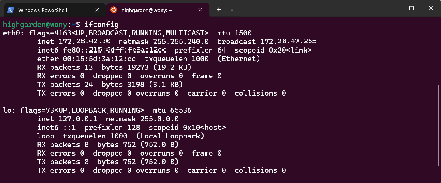 파워셸과 ubuntu터미널은 명령어가 서로 다르기 때문에 ip를 확인하는 명령어도 서로 다르다.