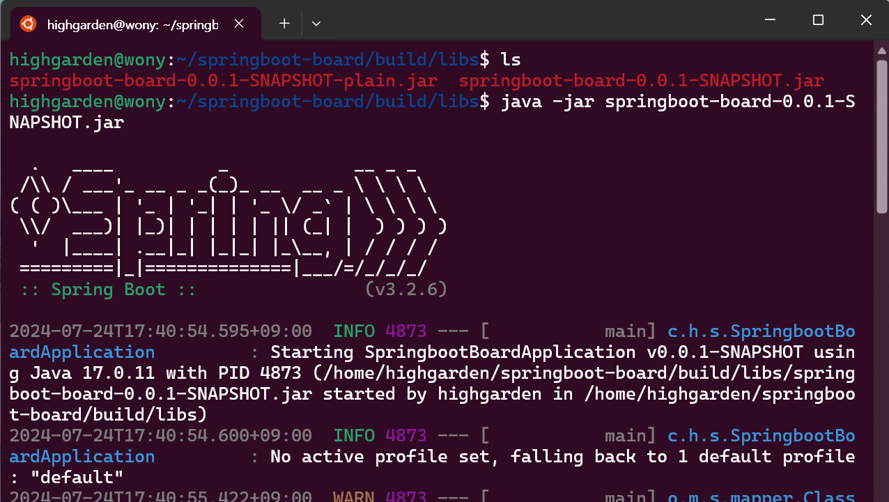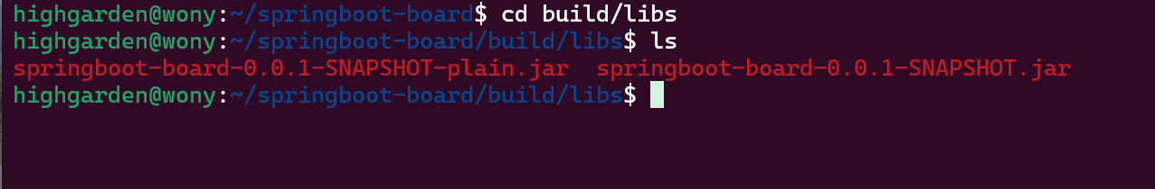 나는 `springboot-board`라는 프로젝트를 wsl(Ubuntu22.04)로 구동중인 리눅스 서버에 복사했다. 이곳에서 프로젝트 배포를 테스트해 볼 수 있다.