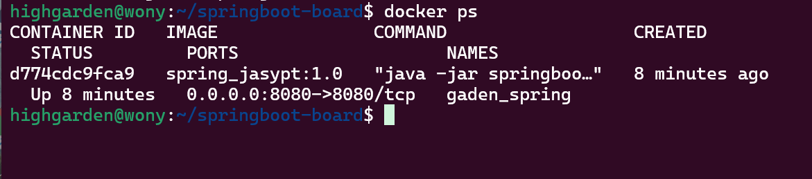 마지막으로 `docker ps` 명령어로 컨테이너가 실행되는지 확인해 보자. 잘 구동된다.