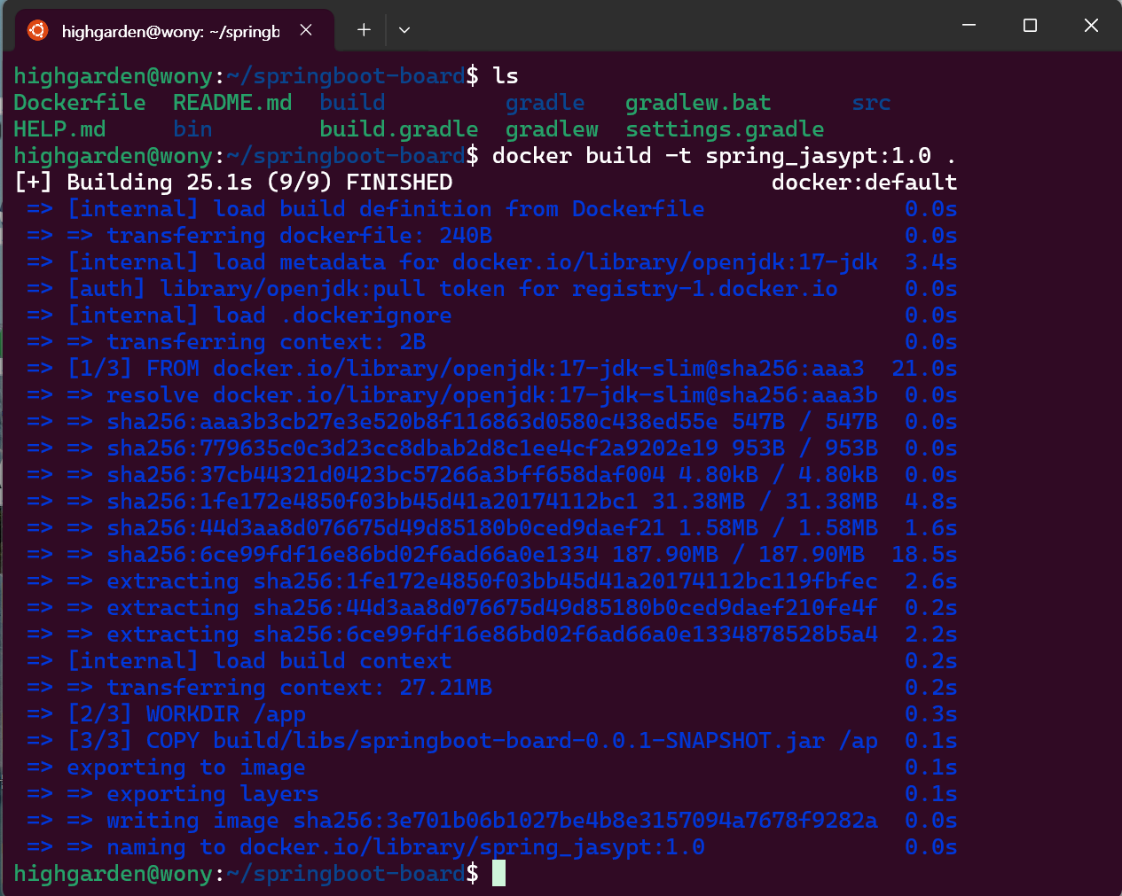 나는 `springboot-board`라는 프로젝트를 wsl(Ubuntu22.04)로 구동중인 리눅스 서버에 복사했다. 이곳에서 프로젝트 배포를 테스트해 볼 수 있다.