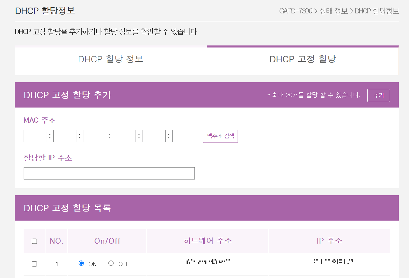 포트포워딩 전에 먼저 해야할 일이 있다. 앞서 공유기는 각각의 장비에 사설 ip를 배정해 준다고 했다. ip를 하나하나 배정하는 것이 어렵기 때문에 동적으로 ip를 배정하는 DHCP(Dynamic Host Configuration Protocol)를 사용한다. 이 때 항상 고정적으로 같은 장비에 같은 ip가 배정되는 것이 아니기 때문에 ip주소가 변경될 수 있다. 홈서버를 구축하려면 항상 같은 ip를 가지고 있어야 서비스를 안정적으로 운영할 수 있다. 때문에 DHCP를 고정할당하여 항상 같은 ip주소를 갖도록 먼저 설정 해주어야 한다.