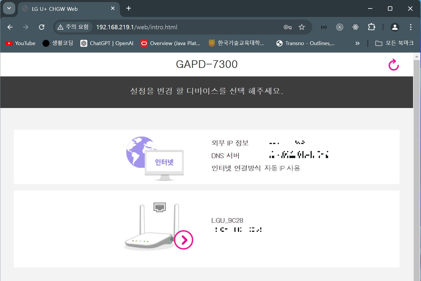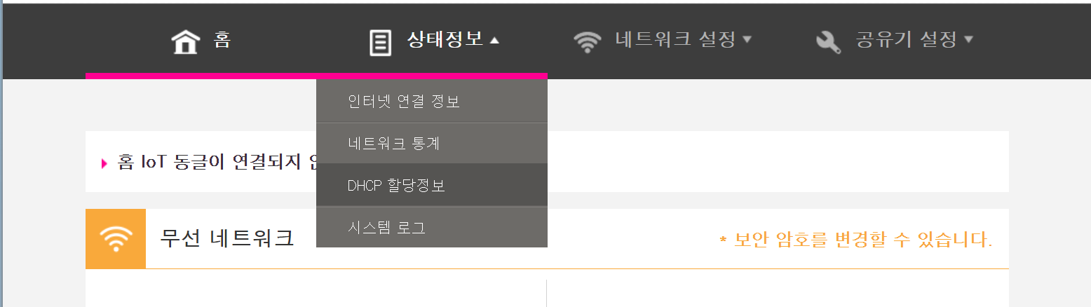 위에서 `ipconfig`으로 조회한 ip구성정보 사진을 보면 기본 게이트웨이라고 쓰인 곳에도 192.xx.xxx로 되어있는 것을 볼 수 있다. 나는 `192.168.219.1`인데 이 주소를 브라우저에 입력하게 되면 공유기 설정페이지로 이동한다. 각자 게이트웨이 ip주소가 다를 수 있다. 확인 후 진행하도록 하자