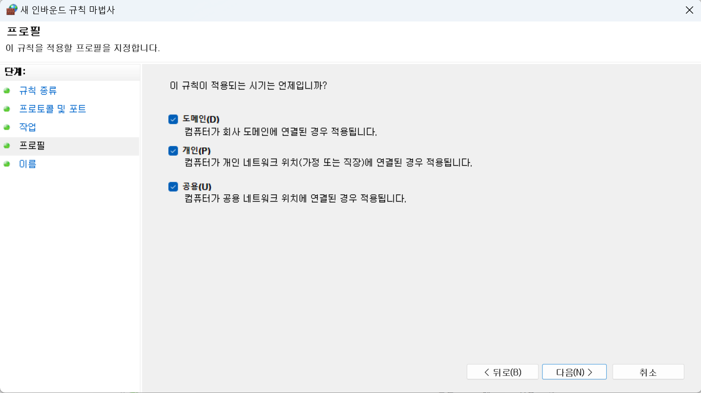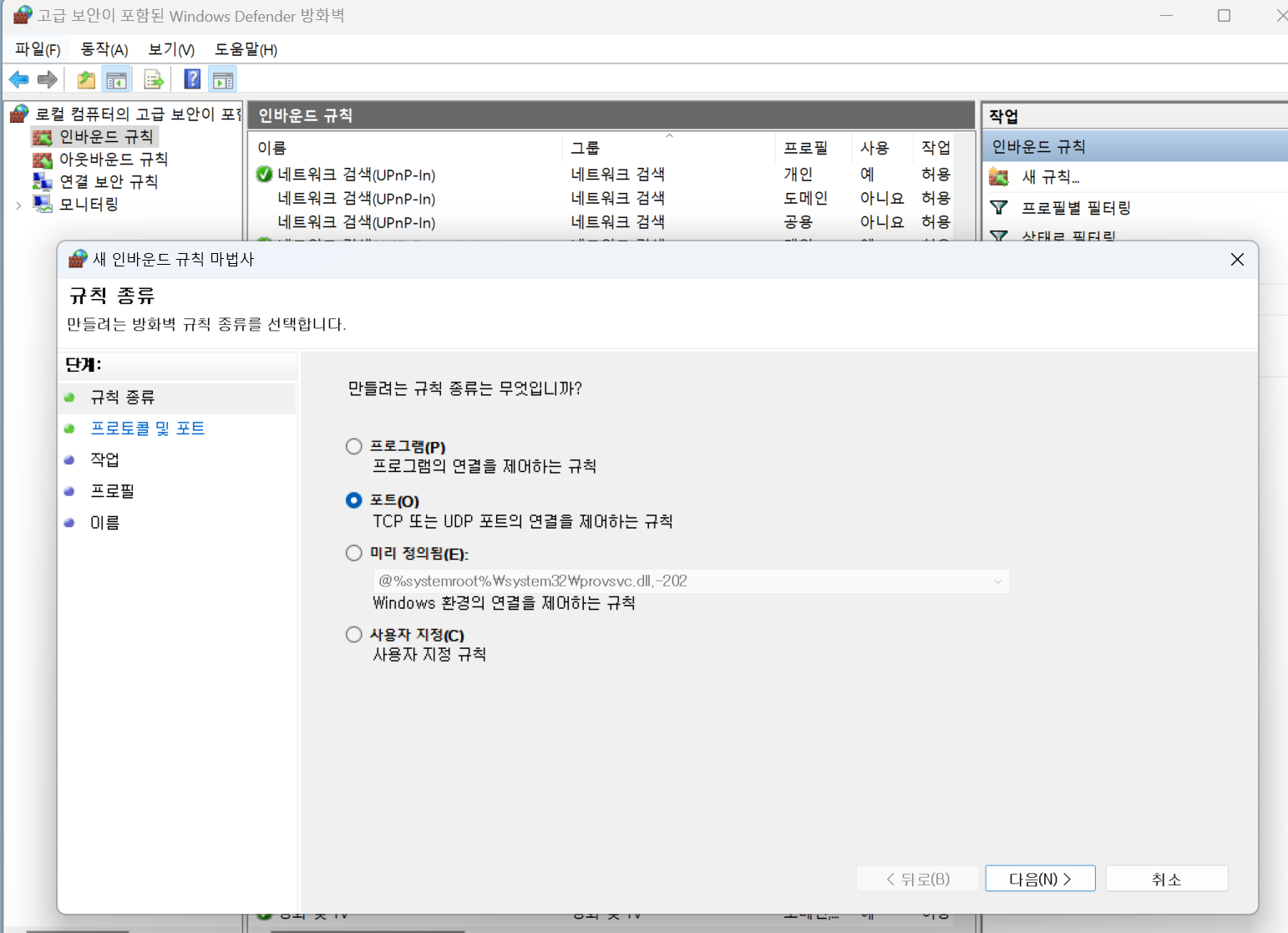 > 고급 보안이 포함된 Windows Defender 방화벽 > 인바운드 규칙