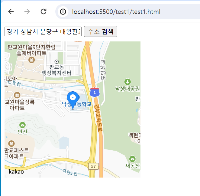 최종적으로 테스트 코드는 이렇게 되는데 API키만 적절한 곳에 잘 끼워넣었다면 바로 실행시켜볼 수 있다. 라이브서버로 실행시켜 보면 다음과 같이 출력된다.